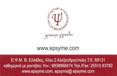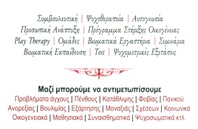 Δέχεται με ραντεβούΣυμβουλευτική Γονέων και ΠάιδωνΨυχοθεραπεία- Βιοματική Εκπαίδευση - Ψυχοθεραπευτικά ΤΕΣΤ