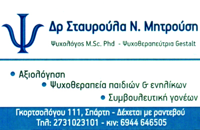Ατομική ψυχοθεραπεία, κατάθλιψη, κρίσεις πανικού, συμβουλευτική παίδων - γονέωνΩράριο: καθημερινά με ραντεβού
